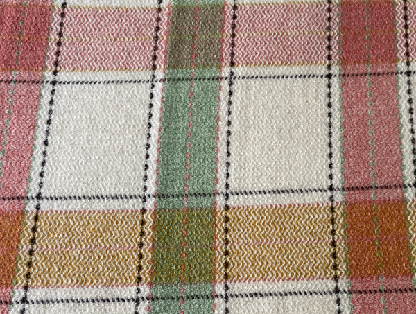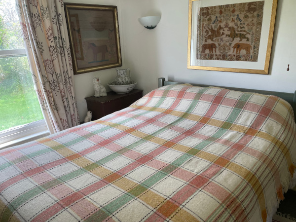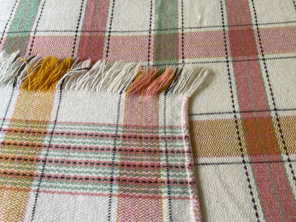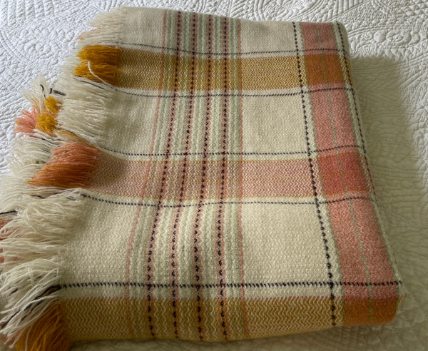 Lovely fresh combination of cream with green, gold and a peachy pink in this vintage Welsh fringed blanket.