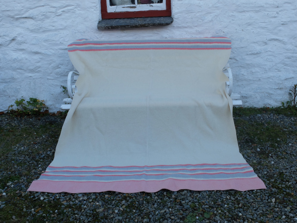 Soft cream with end stripes in pink and pale blue , finished in pink blanket stitch.
